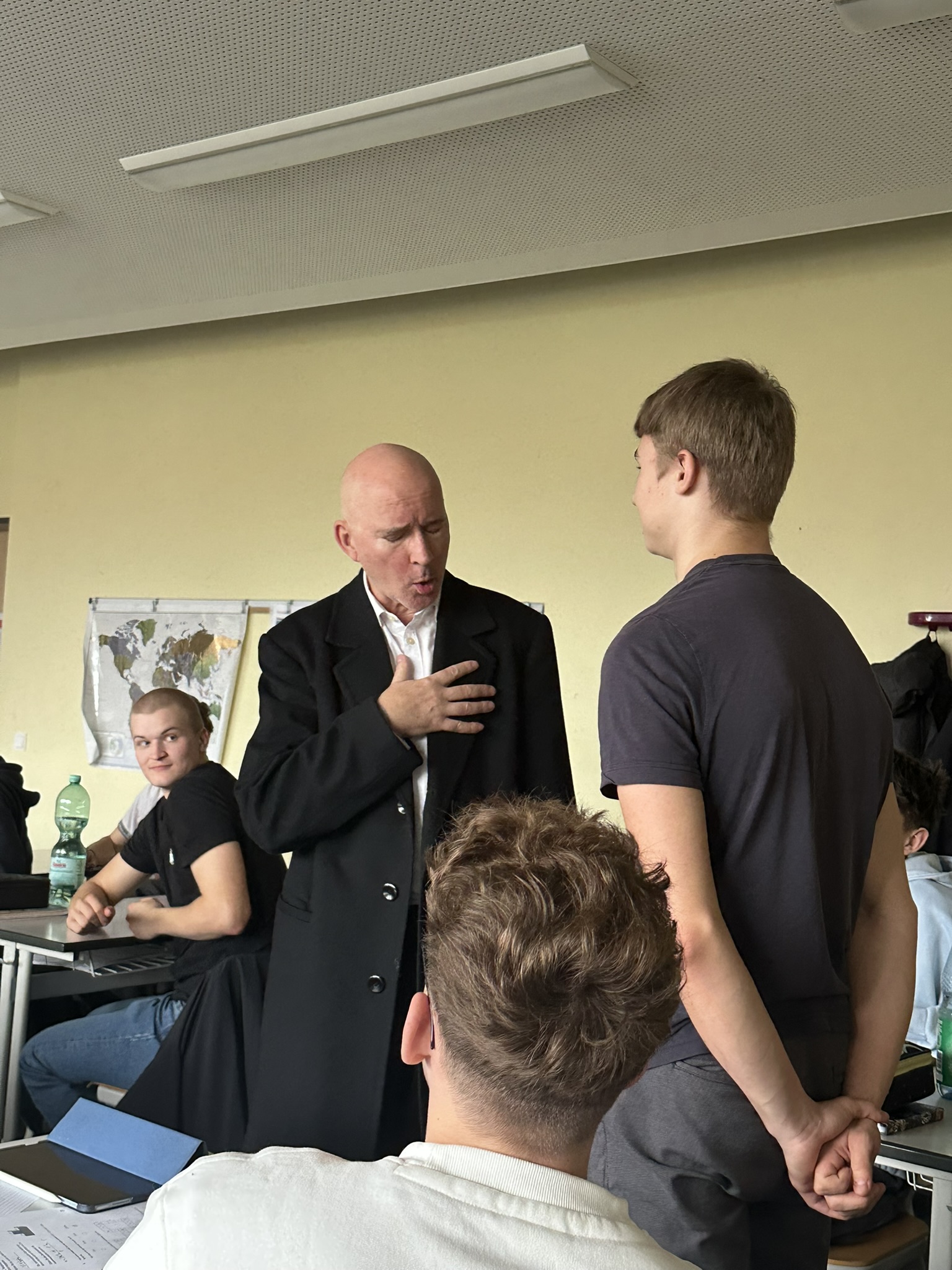 Mehr als eine Tragödie…. gab es am Mittwoch, den 10.12. 2025, in den 10. Klassen der OS Anne Frank Stauchitz. Zuständig dafür war die Landesbühne Sachsen, die uns mit Herrn Pietsch, Schauspieler, Hauptdarsteller und Regisseur in einem, der Tragödie erster Teil ins Klassenzimmer brachte. Auf z. T. sehr unkonventionelle Weise wurden Schüler, Alltagsgegenstände und Schulräume…